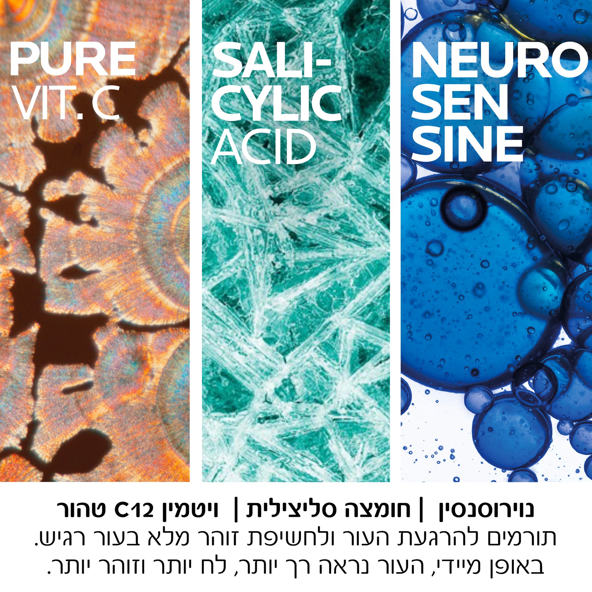 סרום חדשני נגד הזדקנות מסייע בשיקום העור, עם ריכוז גבוה של וימין C טהור, נוגד חמצון ידוע, בשילוב חומצה סליצלית ונוירוסנסין, ותורם להרגעת העור ולחשיפת זוהר מלא בעור רגיש.